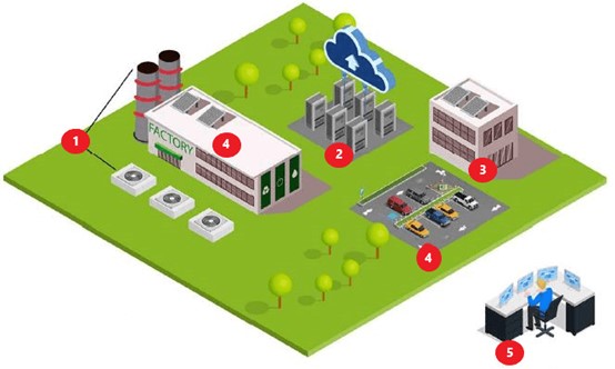 关于工业现场的能源监督管理,对建筑物监督管理软件有什么期望?为了设置场景,下面的草图突出了一个工业基地或特别感兴趣的地区的一些部分。下文草拟了包括在 Syclone x 低碳解决方案中的补救措施,以生成能源和排放流的总体情况,并解决能源消耗问题。